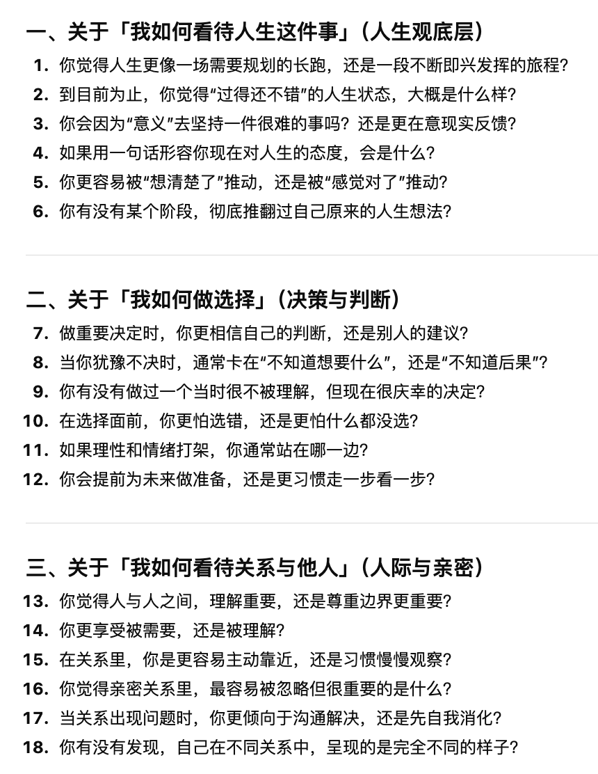 • 这些问题并非抽象讨论,而是直接切入人生观与现实选择,例如: